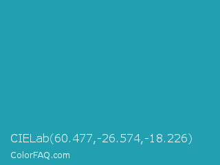 CIELab 60.477,-26.574,-18.226 Color is a normal cyan color and the nearest color is Eastern Blue #1e9ab0. Hex code #22a0b1 and RGB value is rgb(34,160,177). In RGB color space, this color is composed of 13% red, 63% green, 69% blue, In CMYK color space, this color is composed of 81% cyan, 10% magenta, 0% yellow , 31% black , In HSL color space, this color has a hue angle of 187° , 68% saturation and 41% lightness.