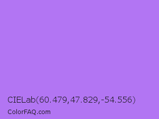 CIELab 60.479,47.829,-54.556 Color is a light violet color and the nearest color is Lavender #b57edc. Hex code #b275f3 and RGB value is rgb(178,117,243). In RGB color space, this color is composed of 70% red, 46% green, 95% blue, In CMYK color space, this color is composed of 27% cyan, 52% magenta, 0% yellow , 5% black , In HSL color space, this color has a hue angle of 269° , 84% saturation and 71% lightness.