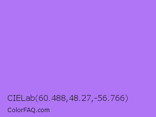CIELab 60.488,48.27,-56.766 Color is a light violet color and the nearest color is Lavender #b57edc. Hex code #b075f7 and RGB value is rgb(176,117,247). In RGB color space, this color is composed of 69% red, 46% green, 97% blue, In CMYK color space, this color is composed of 29% cyan, 53% magenta, 0% yellow , 3% black , In HSL color space, this color has a hue angle of 267° , 89% saturation and 71% lightness.