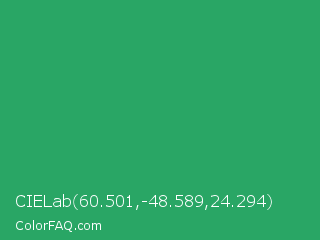 CIELab 60.501,-48.589,24.294 Color is a normal green color and the nearest color is Chateau Green #40a860. Hex code #29a665 and RGB value is rgb(41,166,101). In RGB color space, this color is composed of 16% red, 65% green, 40% blue, In CMYK color space, this color is composed of 75% cyan, 0% magenta, 39% yellow , 35% black , In HSL color space, this color has a hue angle of 149° , 60% saturation and 41% lightness.