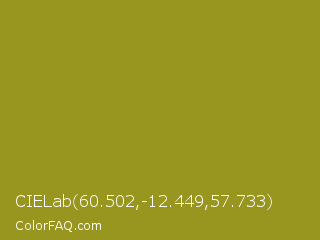 CIELab 60.502,-12.449,57.733 Color is a normal yellow color and the nearest color is Citron #9fa91f. Hex code #99961f and RGB value is rgb(153,150,31). In RGB color space, this color is composed of 60% red, 59% green, 12% blue, In CMYK color space, this color is composed of 0% cyan, 2% magenta, 80% yellow , 40% black , In HSL color space, this color has a hue angle of 59° , 66% saturation and 36% lightness.