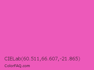 CIELab 60.511,66.607,-21.865 Color is a light magenta color and the nearest color is Brilliant Rose #f653a6. Hex code #ed59ba and RGB value is rgb(237,89,186). In RGB color space, this color is composed of 93% red, 35% green, 73% blue, In CMYK color space, this color is composed of 0% cyan, 62% magenta, 22% yellow , 7% black , In HSL color space, this color has a hue angle of 321° , 80% saturation and 64% lightness.