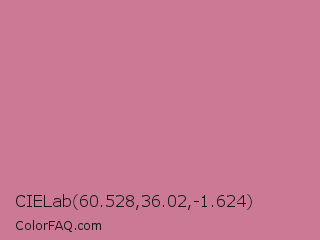 CIELab 60.528,36.02,-1.624 Color is a light rose color and the nearest color is Charm #d47494. Hex code #cc7996 and RGB value is rgb(204,121,150). In RGB color space, this color is composed of 80% red, 47% green, 59% blue, In CMYK color space, this color is composed of 0% cyan, 41% magenta, 26% yellow , 20% black , In HSL color space, this color has a hue angle of 339° , 45% saturation and 64% lightness.