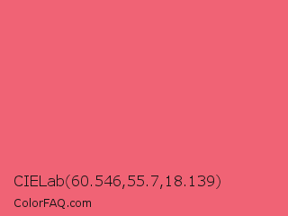 CIELab 60.546,55.7,18.139 Color is a light red color and the nearest color is Light Carmine Pink #e66771. Hex code #f06375 and RGB value is rgb(240,99,117). In RGB color space, this color is composed of 94% red, 39% green, 46% blue, In CMYK color space, this color is composed of 0% cyan, 59% magenta, 51% yellow , 6% black , In HSL color space, this color has a hue angle of 352° , 82% saturation and 66% lightness.