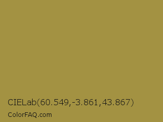 CIELab 60.549,-3.861,43.867 Color is a normal yellow color and the nearest color is Sycamore #908d39. Hex code #a39242 and RGB value is rgb(163,146,66). In RGB color space, this color is composed of 64% red, 57% green, 26% blue, In CMYK color space, this color is composed of 0% cyan, 10% magenta, 60% yellow , 36% black , In HSL color space, this color has a hue angle of 49° , 42% saturation and 45% lightness.