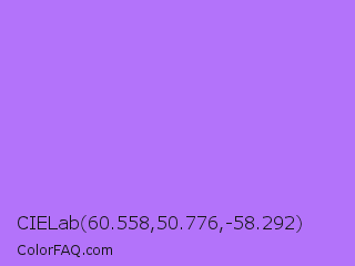 CIELab 60.558,50.776,-58.292 Color is a light violet color and the nearest color is Lavender #b57edc. Hex code #b373fa and RGB value is rgb(179,115,250). In RGB color space, this color is composed of 70% red, 45% green, 98% blue, In CMYK color space, this color is composed of 28% cyan, 54% magenta, 0% yellow , 2% black , In HSL color space, this color has a hue angle of 268° , 93% saturation and 72% lightness.