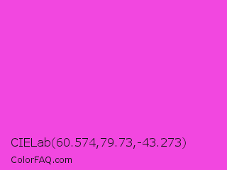 CIELab 60.574,79.73,-43.273 Color is a light magenta color and the nearest color is Purple Pizzazz #fe4eda. Hex code #f247e0 and RGB value is rgb(242,71,224). In RGB color space, this color is composed of 95% red, 28% green, 88% blue, In CMYK color space, this color is composed of 0% cyan, 71% magenta, 7% yellow , 5% black , In HSL color space, this color has a hue angle of 306° , 87% saturation and 61% lightness.