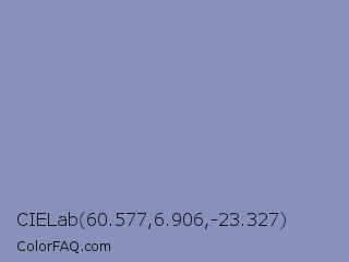 CIELab 60.577,6.906,-23.327 Color is a light blue color and the nearest color is Cool Grey #8c92ac. Hex code #8890bb and RGB value is rgb(136,144,187). In RGB color space, this color is composed of 53% red, 56% green, 73% blue, In CMYK color space, this color is composed of 27% cyan, 23% magenta, 0% yellow , 27% black , In HSL color space, this color has a hue angle of 231° , 27% saturation and 63% lightness.