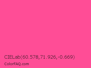 CIELab 60.578,71.926,-0.669 Color is a light rose color and the nearest color is Violet Red #f75394. Hex code #ff4d96 and RGB value is rgb(255,77,150). In RGB color space, this color is composed of 100% red, 30% green, 59% blue, In CMYK color space, this color is composed of 0% cyan, 70% magenta, 41% yellow , 0% black , In HSL color space, this color has a hue angle of 335° , 100% saturation and 65% lightness.