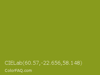 CIELab 60.57,-22.656,58.148 Color is a normal yellow color and the nearest color is Trendy Green #7c881a. Hex code #889b1c and RGB value is rgb(136,155,28). In RGB color space, this color is composed of 53% red, 61% green, 11% blue, In CMYK color space, this color is composed of 12% cyan, 0% magenta, 82% yellow , 39% black , In HSL color space, this color has a hue angle of 69° , 69% saturation and 36% lightness.