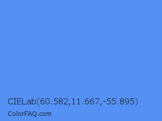 CIELab 60.582,11.667,-55.895 Color is a light blue color and the nearest color is Blueberry #4f86f7. Hex code #5591f5 and RGB value is rgb(85,145,245). In RGB color space, this color is composed of 33% red, 57% green, 96% blue, In CMYK color space, this color is composed of 65% cyan, 41% magenta, 0% yellow , 4% black , In HSL color space, this color has a hue angle of 218° , 89% saturation and 65% lightness.