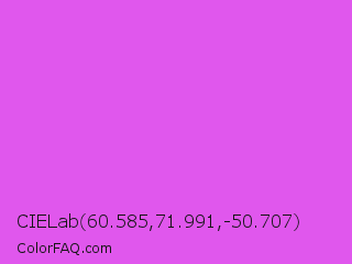 CIELab 60.585,71.991,-50.707 Color is a light magenta color and the nearest color is Heliotrope #df73ff. Hex code #e057ed and RGB value is rgb(224,87,237). In RGB color space, this color is composed of 88% red, 34% green, 93% blue, In CMYK color space, this color is composed of 5% cyan, 63% magenta, 0% yellow , 7% black , In HSL color space, this color has a hue angle of 295° , 81% saturation and 64% lightness.