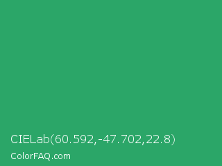 CIELab 60.592,-47.702,22.8 Color is a normal green color and the nearest color is Chateau Green #40a860. Hex code #2ba668 and RGB value is rgb(43,166,104). In RGB color space, this color is composed of 17% red, 65% green, 41% blue, In CMYK color space, this color is composed of 74% cyan, 0% magenta, 37% yellow , 35% black , In HSL color space, this color has a hue angle of 150° , 59% saturation and 41% lightness.