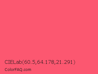 CIELab 60.5,64.178,21.291 Color is a light red color and the nearest color is Fiery Rose #ff5470. Hex code #fc5770 and RGB value is rgb(252,87,112). In RGB color space, this color is composed of 99% red, 34% green, 44% blue, In CMYK color space, this color is composed of 0% cyan, 65% magenta, 56% yellow , 1% black , In HSL color space, this color has a hue angle of 351° , 96% saturation and 66% lightness.