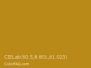 CIELab 60.5,8.801,61.023 Color is a normal orange color and the nearest color is Dark Goldenrod #b8860b. Hex code #ba8a18 and RGB value is rgb(186,138,24). In RGB color space, this color is composed of 73% red, 54% green, 9% blue, In CMYK color space, this color is composed of 0% cyan, 26% magenta, 87% yellow , 27% black , In HSL color space, this color has a hue angle of 42° , 77% saturation and 41% lightness.