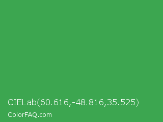 CIELab 60.616,-48.816,35.525 Color is a normal green color and the nearest color is Chateau Green #40a860. Hex code #3ca650 and RGB value is rgb(60,166,80). In RGB color space, this color is composed of 24% red, 65% green, 31% blue, In CMYK color space, this color is composed of 64% cyan, 0% magenta, 52% yellow , 35% black , In HSL color space, this color has a hue angle of 131° , 47% saturation and 44% lightness.