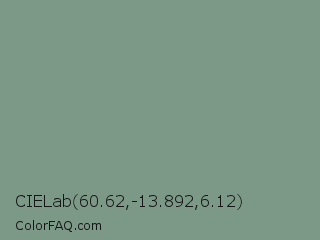 CIELab 60.62,-13.892,6.12 Color is a normal green color and the nearest color is Spanish Green #819885. Hex code #7c9987 and RGB value is rgb(124,153,135). In RGB color space, this color is composed of 49% red, 60% green, 53% blue, In CMYK color space, this color is composed of 19% cyan, 0% magenta, 12% yellow , 40% black , In HSL color space, this color has a hue angle of 143° , 12% saturation and 54% lightness.
