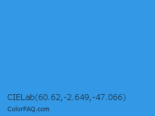 CIELab 60.62,-2.649,-47.066 Color is a normal blue color and the nearest color is Bleu De France #318ce7. Hex code #3398e5 and RGB value is rgb(51,152,229). In RGB color space, this color is composed of 20% red, 60% green, 90% blue, In CMYK color space, this color is composed of 78% cyan, 34% magenta, 0% yellow , 10% black , In HSL color space, this color has a hue angle of 206° , 77% saturation and 55% lightness.