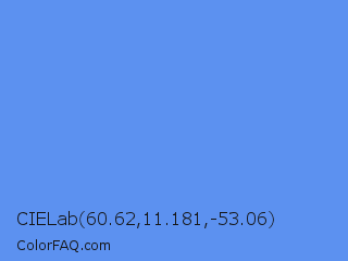 CIELab 60.62,11.181,-53.06 Color is a light blue color and the nearest color is Cornflower Blue #6495ed. Hex code #5c91f0 and RGB value is rgb(92,145,240). In RGB color space, this color is composed of 36% red, 57% green, 94% blue, In CMYK color space, this color is composed of 62% cyan, 40% magenta, 0% yellow , 6% black , In HSL color space, this color has a hue angle of 219° , 83% saturation and 65% lightness.