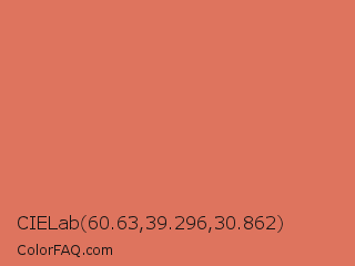 CIELab 60.63,39.296,30.862 Color is a light red color and the nearest color is Terracotta #e2725b. Hex code #de745e and RGB value is rgb(222,116,94). In RGB color space, this color is composed of 87% red, 45% green, 37% blue, In CMYK color space, this color is composed of 0% cyan, 48% magenta, 58% yellow , 13% black , In HSL color space, this color has a hue angle of 10° , 66% saturation and 62% lightness.