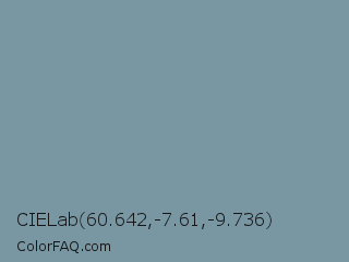 CIELab 60.642,-7.61,-9.736 Color is a normal blue color and the nearest color is Weldon Blue #7c98ab. Hex code #7997a3 and RGB value is rgb(121,151,163). In RGB color space, this color is composed of 47% red, 59% green, 64% blue, In CMYK color space, this color is composed of 26% cyan, 7% magenta, 0% yellow , 36% black , In HSL color space, this color has a hue angle of 197° , 19% saturation and 56% lightness.