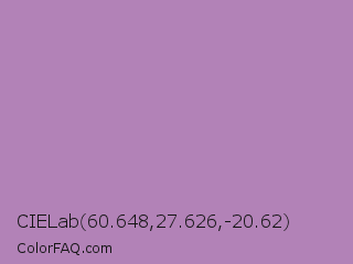 CIELab 60.648,27.626,-20.62 Color is a light magenta color and the nearest color is African Violet #b284be. Hex code #b282b7 and RGB value is rgb(178,130,183). In RGB color space, this color is composed of 70% red, 51% green, 72% blue, In CMYK color space, this color is composed of 3% cyan, 29% magenta, 0% yellow , 28% black , In HSL color space, this color has a hue angle of 294° , 27% saturation and 61% lightness.