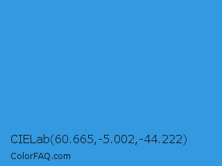 CIELab 60.665,-5.002,-44.222 Color is a normal blue color and the nearest color is Bleu De France #318ce7. Hex code #3399e0 and RGB value is rgb(51,153,224). In RGB color space, this color is composed of 20% red, 60% green, 88% blue, In CMYK color space, this color is composed of 77% cyan, 32% magenta, 0% yellow , 12% black , In HSL color space, this color has a hue angle of 205° , 74% saturation and 54% lightness.