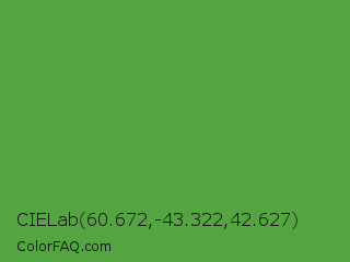 CIELab 60.672,-43.322,42.627 Color is a normal green color and the nearest color is Apple #4fa83d. Hex code #55a442 and RGB value is rgb(85,164,66). In RGB color space, this color is composed of 33% red, 64% green, 26% blue, In CMYK color space, this color is composed of 48% cyan, 0% magenta, 60% yellow , 36% black , In HSL color space, this color has a hue angle of 108° , 43% saturation and 45% lightness.
