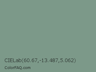 CIELab 60.67,-13.487,5.062 Color is a normal green color and the nearest color is Spanish Green #819885. Hex code #7c9989 and RGB value is rgb(124,153,137). In RGB color space, this color is composed of 49% red, 60% green, 54% blue, In CMYK color space, this color is composed of 19% cyan, 0% magenta, 10% yellow , 40% black , In HSL color space, this color has a hue angle of 147° , 12% saturation and 54% lightness.