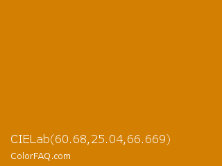 CIELab 60.68,25.04,66.669 Color is a normal orange color and the nearest color is Meteor #d07d12. Hex code #d27f02 and RGB value is rgb(210,127,2). In RGB color space, this color is composed of 82% red, 50% green, 1% blue, In CMYK color space, this color is composed of 0% cyan, 40% magenta, 99% yellow , 18% black , In HSL color space, this color has a hue angle of 36° , 98% saturation and 42% lightness.