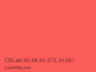 CIELab 60.68,60.373,34.66 Color is a light red color and the nearest color is Sunset Orange #fd5e53. Hex code #fb5c59 and RGB value is rgb(251,92,89). In RGB color space, this color is composed of 98% red, 36% green, 35% blue, In CMYK color space, this color is composed of 0% cyan, 63% magenta, 65% yellow , 2% black , In HSL color space, this color has a hue angle of 1° , 95% saturation and 67% lightness.