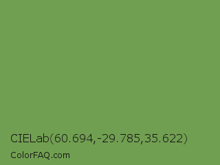CIELab 60.694,-29.785,35.622 Color is a normal green color and the nearest color is Asparagus Green #7ba05b. Hex code #719f51 and RGB value is rgb(113,159,81). In RGB color space, this color is composed of 44% red, 62% green, 32% blue, In CMYK color space, this color is composed of 29% cyan, 0% magenta, 49% yellow , 38% black , In HSL color space, this color has a hue angle of 95° , 33% saturation and 47% lightness.