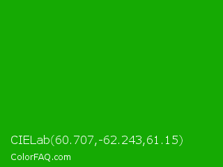 CIELab 60.707,-62.243,61.15 Color is a normal green color and the nearest color is Islamic Green #009000. Hex code #15aa03 and RGB value is rgb(21,170,3). In RGB color space, this color is composed of 8% red, 67% green, 1% blue, In CMYK color space, this color is composed of 88% cyan, 0% magenta, 98% yellow , 33% black , In HSL color space, this color has a hue angle of 114° , 97% saturation and 34% lightness.