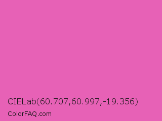 CIELab 60.707,60.997,-19.356 Color is a light magenta color and the nearest color is Hot Pink #ff69b4. Hex code #e761b6 and RGB value is rgb(231,97,182). In RGB color space, this color is composed of 91% red, 38% green, 71% blue, In CMYK color space, this color is composed of 0% cyan, 58% magenta, 21% yellow , 9% black , In HSL color space, this color has a hue angle of 322° , 74% saturation and 64% lightness.
