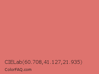 CIELab 60.708,41.127,21.935 Color is a light red color and the nearest color is Candy Pink #e4717a. Hex code #de736e and RGB value is rgb(222,115,110). In RGB color space, this color is composed of 87% red, 45% green, 43% blue, In CMYK color space, this color is composed of 0% cyan, 48% magenta, 50% yellow , 13% black , In HSL color space, this color has a hue angle of 3° , 63% saturation and 65% lightness.