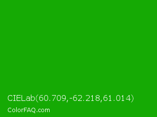 CIELab 60.709,-62.218,61.014 Color is a normal green color and the nearest color is Islamic Green #009000. Hex code #15aa04 and RGB value is rgb(21,170,4). In RGB color space, this color is composed of 8% red, 67% green, 2% blue, In CMYK color space, this color is composed of 88% cyan, 0% magenta, 98% yellow , 33% black , In HSL color space, this color has a hue angle of 114° , 95% saturation and 34% lightness.