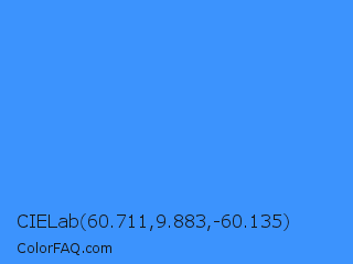 CIELab 60.711,9.883,-60.135 Color is a light blue color and the nearest color is Brilliant Azure #3399ff. Hex code #3c93fd and RGB value is rgb(60,147,253). In RGB color space, this color is composed of 24% red, 58% green, 99% blue, In CMYK color space, this color is composed of 76% cyan, 42% magenta, 0% yellow , 1% black , In HSL color space, this color has a hue angle of 213° , 98% saturation and 61% lightness.