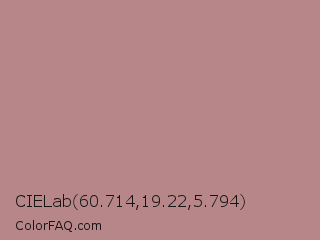 CIELab 60.714,19.22,5.794 Color is a light red color and the nearest color is Brandy Rose #bb8983. Hex code #b78689 and RGB value is rgb(183,134,137). In RGB color space, this color is composed of 72% red, 53% green, 54% blue, In CMYK color space, this color is composed of 0% cyan, 27% magenta, 25% yellow , 28% black , In HSL color space, this color has a hue angle of 356° , 25% saturation and 62% lightness.