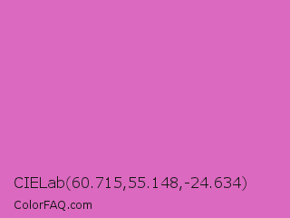 CIELab 60.715,55.148,-24.634 Color is a light magenta color and the nearest color is Sky Magenta #cf71af. Hex code #db69bf and RGB value is rgb(219,105,191). In RGB color space, this color is composed of 86% red, 41% green, 75% blue, In CMYK color space, this color is composed of 0% cyan, 52% magenta, 13% yellow , 14% black , In HSL color space, this color has a hue angle of 315° , 61% saturation and 64% lightness.