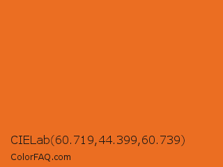 CIELab 60.719,44.399,60.739 Color is a normal orange color and the nearest color is Vivid Tangelo #f07427. Hex code #eb6e22 and RGB value is rgb(235,110,34). In RGB color space, this color is composed of 92% red, 43% green, 13% blue, In CMYK color space, this color is composed of 0% cyan, 53% magenta, 86% yellow , 8% black , In HSL color space, this color has a hue angle of 23° , 83% saturation and 53% lightness.