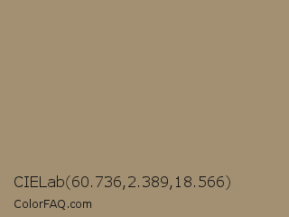 CIELab 60.736,2.389,18.566 Color is a normal orange color and the nearest color is Donkey Brown #a69279. Hex code #a39072 and RGB value is rgb(163,144,114). In RGB color space, this color is composed of 64% red, 56% green, 45% blue, In CMYK color space, this color is composed of 0% cyan, 12% magenta, 30% yellow , 36% black , In HSL color space, this color has a hue angle of 37° , 21% saturation and 54% lightness.