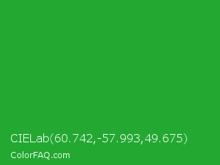 CIELab 60.742,-57.993,49.675 Color is a normal green color and the nearest color is Wageningen Green #34b233. Hex code #23a931 and RGB value is rgb(35,169,49). In RGB color space, this color is composed of 14% red, 66% green, 19% blue, In CMYK color space, this color is composed of 79% cyan, 0% magenta, 71% yellow , 34% black , In HSL color space, this color has a hue angle of 126° , 66% saturation and 40% lightness.