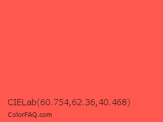 CIELab 60.754,62.36,40.468 Color is a light red color and the nearest color is Sunset Orange #fd5e53. Hex code #ff594f and RGB value is rgb(255,89,79). In RGB color space, this color is composed of 100% red, 35% green, 31% blue, In CMYK color space, this color is composed of 0% cyan, 65% magenta, 69% yellow , 0% black , In HSL color space, this color has a hue angle of 3° , 100% saturation and 65% lightness.