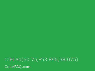 CIELab 60.75,-53.896,38.075 Color is a normal green color and the nearest color is Wageningen Green #34b233. Hex code #28a84b and RGB value is rgb(40,168,75). In RGB color space, this color is composed of 16% red, 66% green, 29% blue, In CMYK color space, this color is composed of 76% cyan, 0% magenta, 55% yellow , 34% black , In HSL color space, this color has a hue angle of 136° , 62% saturation and 41% lightness.