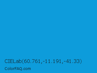 CIELab 60.761,-11.191,-41.33 Color is a normal blue color and the nearest color is Rich Electric Blue #0892d0. Hex code #0d9cdb and RGB value is rgb(13,156,219). In RGB color space, this color is composed of 5% red, 61% green, 86% blue, In CMYK color space, this color is composed of 94% cyan, 29% magenta, 0% yellow , 14% black , In HSL color space, this color has a hue angle of 198° , 89% saturation and 45% lightness.
