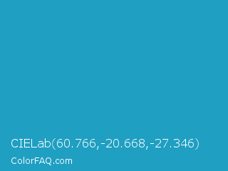 CIELab 60.766,-20.668,-27.346 Color is a normal cyan color and the nearest color is Pacific Blue #1ca9c9. Hex code #1f9fc2 and RGB value is rgb(31,159,194). In RGB color space, this color is composed of 12% red, 62% green, 76% blue, In CMYK color space, this color is composed of 84% cyan, 18% magenta, 0% yellow , 24% black , In HSL color space, this color has a hue angle of 193° , 72% saturation and 44% lightness.