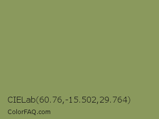 CIELab 60.76,-15.502,29.764 Color is a normal lime color and the nearest color is Moss Green #8a9a5b. Hex code #8a995d and RGB value is rgb(138,153,93). In RGB color space, this color is composed of 54% red, 60% green, 36% blue, In CMYK color space, this color is composed of 10% cyan, 0% magenta, 39% yellow , 40% black , In HSL color space, this color has a hue angle of 75° , 24% saturation and 48% lightness.