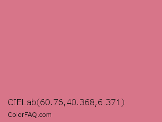 CIELab 60.76,40.368,6.371 Color is a light red color and the nearest color is Charm #d47494. Hex code #d77589 and RGB value is rgb(215,117,137). In RGB color space, this color is composed of 84% red, 46% green, 54% blue, In CMYK color space, this color is composed of 0% cyan, 46% magenta, 36% yellow , 16% black , In HSL color space, this color has a hue angle of 348° , 55% saturation and 65% lightness.
