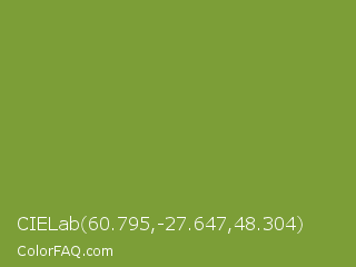 CIELab 60.795,-27.647,48.304 Color is a normal green color and the nearest color is Palm Leaf #6f9940. Hex code #7c9e37 and RGB value is rgb(124,158,55). In RGB color space, this color is composed of 49% red, 62% green, 22% blue, In CMYK color space, this color is composed of 22% cyan, 0% magenta, 65% yellow , 38% black , In HSL color space, this color has a hue angle of 80° , 48% saturation and 42% lightness.