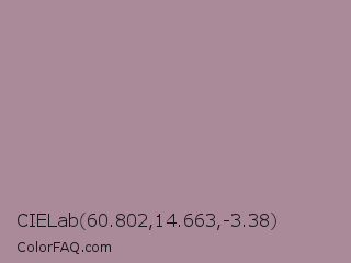 CIELab 60.802,14.663,-3.38 Color is a normal rose color and the nearest color is Bouquet #ae809e. Hex code #aa8a99 and RGB value is rgb(170,138,153). In RGB color space, this color is composed of 67% red, 54% green, 60% blue, In CMYK color space, this color is composed of 0% cyan, 19% magenta, 10% yellow , 33% black , In HSL color space, this color has a hue angle of 332° , 16% saturation and 60% lightness.